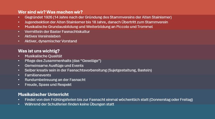 Wenn du gerne einmal Fasnacht machen möchtest, kannst du dich gerne bei uns melden. Es ist nach Absprache auch möglich, einmal in den Musikunterricht hineinzuschnuppern oder an einer Fasnacht mitzulaufen, um selbst zu erleben was es heisst, bei den Jungen Stainlemer Fasnacht zu machen. Hierfür dürft ihr euch gerne an unseren Obmann der Jungen Garde, Steve Isler, wenden: steve.isler@gmx.ch